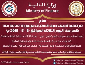 أعلنت وزارة المالية بحكومة الوفاق الوطني عن تنفيذ أذونات صرف مرتبات شهري “مارس وإبريل” الثلاثاء لكافة الجهات وإحالتها إلى مصرف ليبيا المركزي مضيفة بأنها سوف تقوم بإحالة مرتبات شهر “مايو” منتصف الشهر بمناسبة قدوم شهر رمضان المبارك.