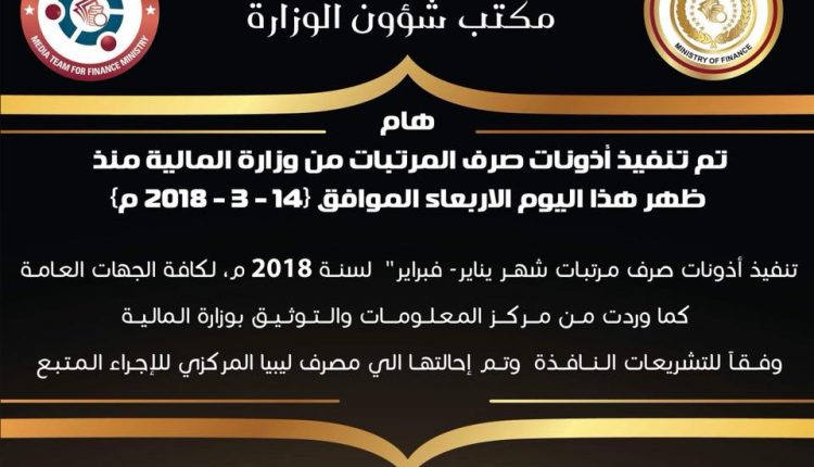 أعلنت وزارة المالية بحكومة الوفاق الوطني عن تنفيذ أذونات صرف مرتبات شهري”يناير _ وفبراير” الأربعاء واحالتها إلى مصرف ليبيا المركزي.