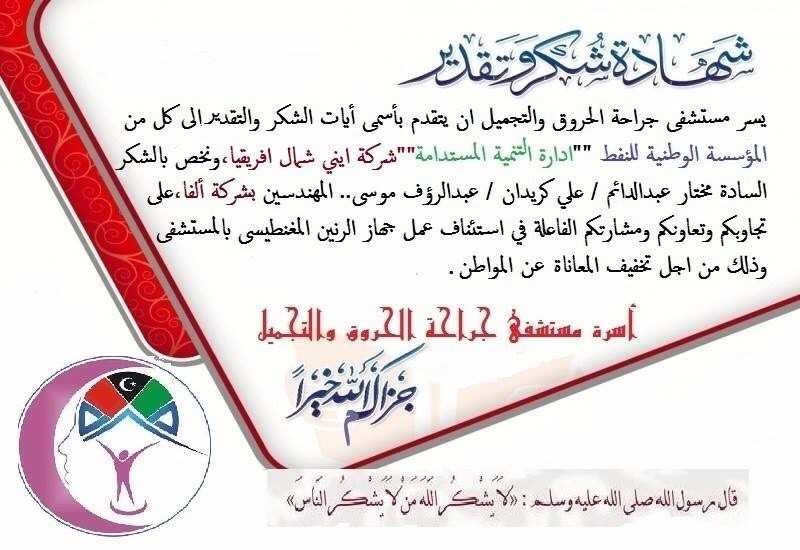 ضمن برامج المسؤولية الاجتماعية بالمؤسسة الوطنية للنفط وبرعاية من شركة ايني الايطالية، تم يوم الاتنين الاثنين 25 ديسمبر اعادة تشغيل جهاز الرنين المغناطيسي بمستشفى الحروق بطرابلس والمتوقف لأكثر من سنتين بعد أن تم توفير قطع الغيار المطلوبة وتزويده بغاز الهيليوم.