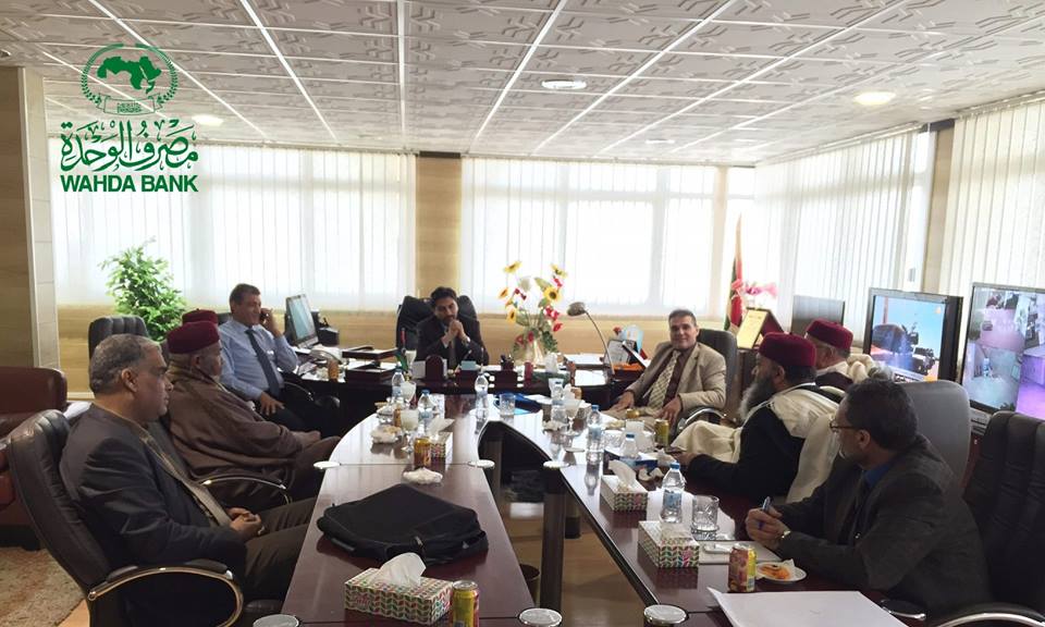 عقــد مصرف الوحدة اليوم الاربعاء اجتماعاً بالادارة العامـــة للمصرف وقد حضر هذا الاجتماع كلاً من  ” مرعي البرعصي ” المديـــر العام لمصـــرف الوحدة مع وفداً مــن أعيـــان و مشايخ مدينة جالو المكون من ” عبد الهادي اسماعيل ” احد اعيان و مشائخ قبيلة المجابرة و رئيس المجلس الاعلى لقبائل الجبارنة , و” فتحي المعــوج ” احد اعيان القبيلة , و ” محمد صالــح ” منسق العام للقبيلة .