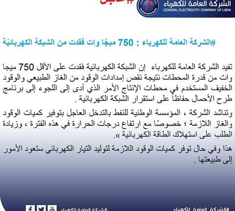 ذكرت دائرة الاعلام بالشركة العامة للكهرباء ، أن الشبكة الكهربائية فقدت 750 ميغاوات نتيجة نقص امدادات الوقود والغاز الطبيعي والوقود الخفيف