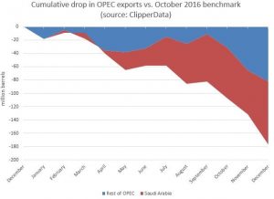 حيث أشار الكاتب في تقريره إلى الرسم البياني المرفق ، والذي يظهر الانخفاض التراكمي في صادرات الأوبك لعام 2017 مقابل المستوى المرجعي في أكتوبر 2016. حيث ذكر في التقرير، إن إجمالي الواردات المخفضة لأوبك وصل مجموعه إلى 180 مليون برميل لعام 2017 ، وبهذا التخفيض 180 مليون برميل، تكون المملكة العربية السعودية قد أستحوذت على نحو 100 مليون برميل، وهي القوة الدافعة وراء جهود إعادة التوازن.
