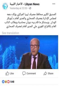 وقد نشرت صحيفة الأخبار الليبية  الألكترونية ” Libyan News” أمس الأربعاء خبر مفاده ” أن الصديق الكبير محافظ مصرف ليبيا المركزي يؤكد دعمه لمجلس الإدارة بمصرف الصحاري والمدير العام د.أبوبكر الودان ويستنكر ما قام بيه ديوان محاسبة ويطالب النائب العام بالإفراج الفوري عن المدير العام لمصرف الصحاري”..