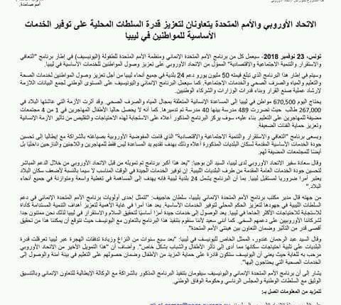 أعلن الاتحاد الأوروبي عن إطلاقه بالتعاون مع برنامج الأمم المتحدة الإنمائي ومنظمة الأمم المتحدة للطفولة “اليونيسيف” برنامج لدعم البلديات في ليبيا بقيمة إجمالية قدرها 50 مليون يورو.