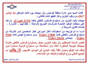 الشركة طمأنت الموطنين بتوفر البنزين بمستودع طرابلس النفطي مع توقع وصول ناقلة نقل البنزين خلال الايام الماضية مناشدة إياهم التحلي بالروح الوطنية والابتعاد عن الاشاعات .