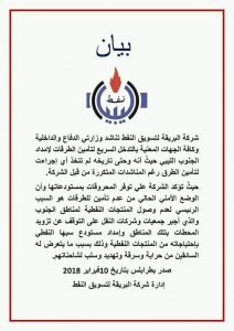 البريقة لتسويق النفط تصدر بياناً بخصوص نقص الوقود بالمنطقة الجنوبية