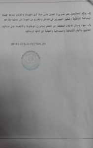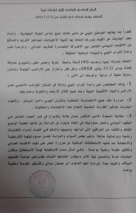 كما طالب البيان المبعوث الأممي “غسان سلامة” بضرورة تحمل مسؤولياته واتخاذ ما يلزم لحلحلة الوضع وكسر الجمود الحاصل في المشهد السياسي والدفع في اتجاه إجراء انتخابات رئاسية وبرلمانية عاجلة، وكذلك طالب البيان بدعم جهود المصالحة الوطنية وتمكين المهجرين في الداخل والخارج من العودة لمدنهم بأسرع وقت ممكن.