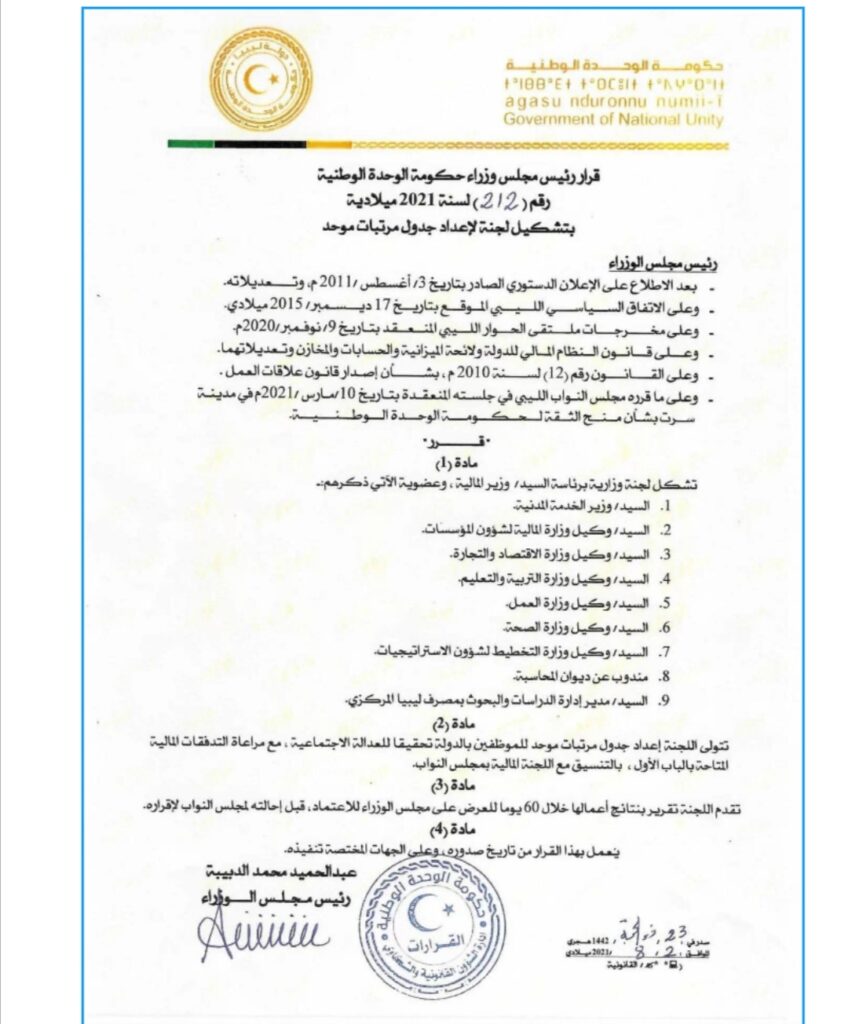 من جانبي أرى أن حكومة الوحدة الوطنية كان الأولى بها اتخاذ خطوتين إثنين أبسط بكثير من الزيادة في مرتبات شرائح بذاتها، وهاتان الخطوتان سيكون لهما آثار ايجابية على مستوى معيشة كل الليبيين في حال تبنيهما من قبل الحكومة وهما:- خفض سعر صرف العملات الأجنبية مقابل الدينار الليبي أي بمعنى زيادة القوة الشرائية للدينار الليبي أولاً، والعمل على تذويب الفوارق أو ردم الهوة ((Gap بين مرتبات الليبيين ثانياً، والذي يتم من خلال إقرار جدول أو جداول مرتبات متقاربة لأغلب الشرائح خصوصاً أن مجلس وزراء حكومة الوحدة الوطنية قد اتخذ قراراً بالخصوص حمل الرقم 212 لسنة 2021.