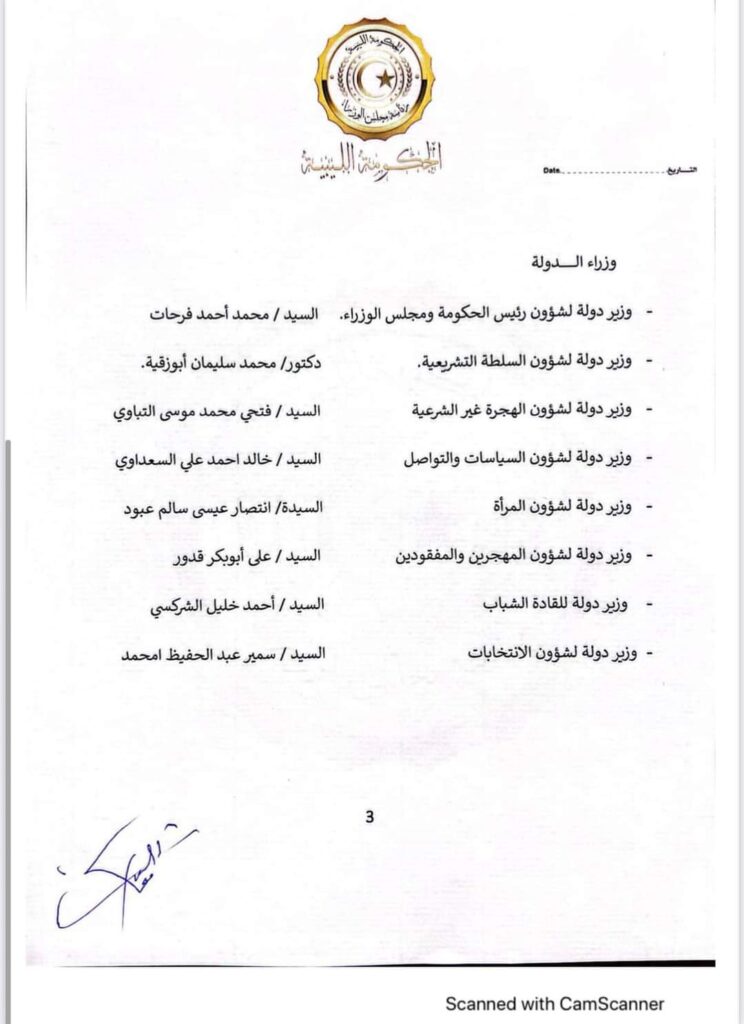 أما عن وزارة الدولة محمد أحمد فرحات وزيراً للشؤون رئيس الحكومة ومجلس الوزراء ومحمد سليمان ابوزقية وزيراً للشؤون السلطة التشريعية وفتحي موسى التباوي وزيراً للشؤون الهجرة الغير شرعية وخالد احمد علي السعداوي وزيرا