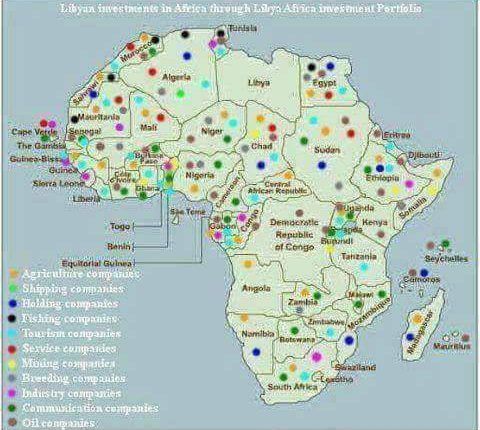 ثم تابعا موضحا أن هذه الخريطة الإستثمارية تبين فقط قارة أفريقيا، والقارات الأخرى القريبة والبعيدة لها أيضا نصيبها من الإستثمارات الممولة بأموال الشعب الواقف في الطوابير.