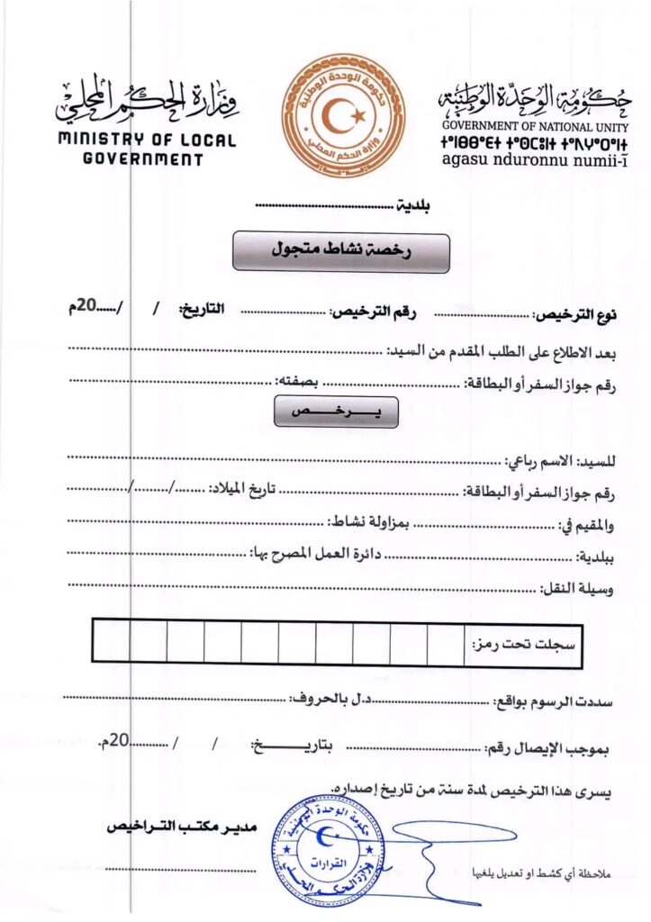 أصدر وزير الحكم المحلي بحكومة الوحدة الوطنية “بدرالدين التومي” قرار رقم 1192 لسنة 2022 م بشأن اعتماد نموذج رخصة نشاط متجول.