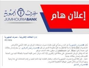 كما أعلن المصرف بأنه سيتم إصدار بطاقات فيزا جديدة وهي ” فيزا Blue و”فيزا platinum “وأن سقف السحب مرتفع، مضيفا بأن الزبائن المتحصلين على بطاقة “فيزا إلكترون 10 ألاف دولار” شحن القيمة الجديدة بالبطاقة ذاتها دون الحاجة لتقديم طلب إصدار بطاقات جديدة.