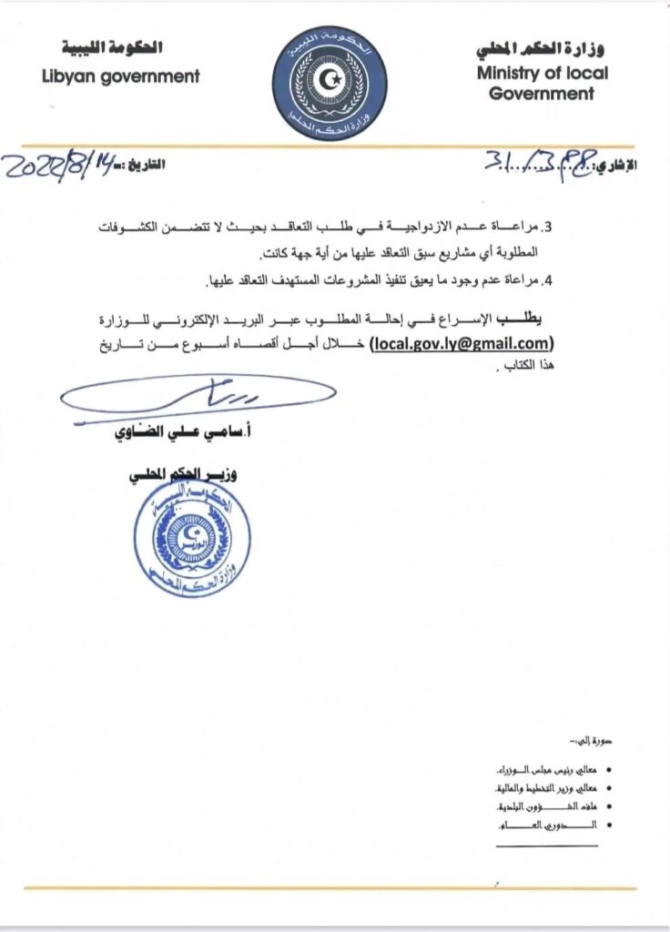 عمم وزير الحكم المحلي بالحكومة الليبية المكلفة من قبل البرلمان رسالة إلى عمداء البلديات، تقتضي بضرورة تزويد وزارة الحكم المحلي بالمشاريع العاجلة والضرورية التي تعالج المختنقات التي تعترض تقديم الخدمات الأساسية وتلبي حاجة المواطن الكريم في كافة مناطق ليبيا على أن يتم تجهيز وإعداد المطلوب بمراعاة ما يلي.