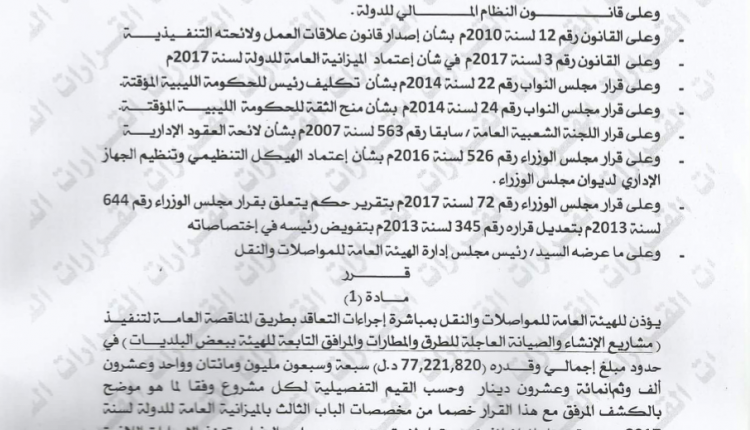 أخبار الحكومة المؤقتة تخصص 77 مليون دينار لهيئة المواصلات بواسطة Echo of Libya في نوفمبر 19, 2017 139 شارك أصدرت الحكومة المؤقتة قراراً تحت رقم (389) بمنح إذن لهيئة المواصلات والنقل لتنفيذ مشاريع الانشاء والصيانة العاجلة للطرق والمرافق التابعة للهيئة ببعض البلديات بما يقارب 77 مليون دينار ليبي. 139 شارك FacebookTwitterGoogle+ReddItWhatsAppPinterestالبريد الإلكتروني