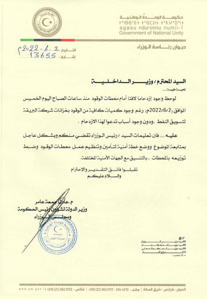 وجه رئيس حكومة الوحدة الوطنية تعليماته لشركة البريقة بوضع خطة ناجعة لتزويد المحطات بالوقود على مدار 24 ساعة والتنسيق مع وزارة الداخلية لتأمين وتنظم العمل بالمحطات.