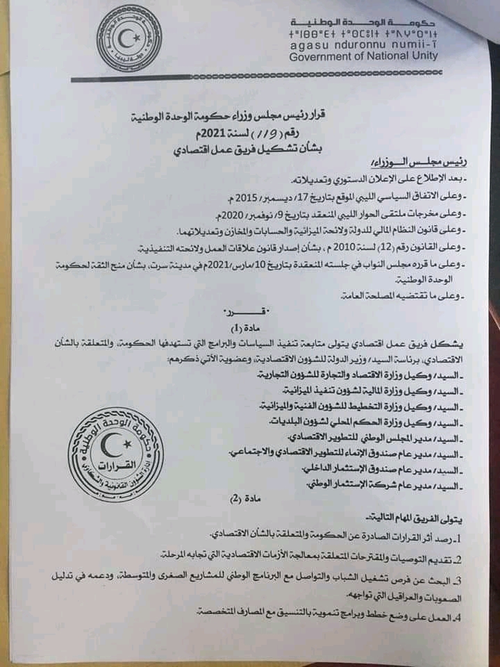 أصدر رئيس مجلس الوزراء بحكومة الوحدة الوطنية “عبدالحميد الدبيبة” قرار رقم 119 لسنة 2021 بشأن تشكيل فريق عمل اقتصادي.