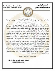 وحذر المجلس الرئاسي بحكومة الوفاق كل من يحاول أستغلال الوضع الأمني في العاصمة طرابلس وباقي المدن الليبية ، من المجرمين وعديمي الضمائر .