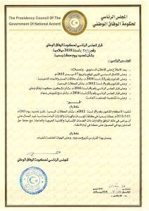 قرر المجلس الرئاسي لحكومة الوفاق الوطني تحديد الثلاثاء الأول من مايو عطلة رسمية في كافة المؤسسات والهيئات والادارات الحكومية وذلك بمناسبة عيد العمال الذي يحتفل به العالم في مثل هذا اليوم من كل عام، وطلب المجلس في قراره مراعاة المرافق الخاصة بالخدمات الإنسانية والأمنية الحيوية والعاجلة مع حفظ حقوق العاملين بها في الحصول على عطلة في أيام.