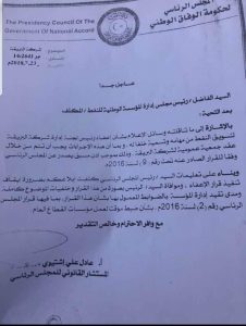 طالب “عادل اشتيوي” المستشار القانوني لرئيس المجلس الرئاسي لحكومة الوفاق الوطني رئيس مجلس إدارة المؤسسة الوطنية للنفط “المكلف” إيقاف تنفيذ قرار اعفاء رئيس لجنة إدارة شركة البريقة لتسويق النفط من مهامه، وتسمية خليفة له بناءً على مطلب رئيس المجلس الرئاسي” فائز السراج بحسب المخاطبة.