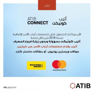 أعلن مصرف السراي للتجارة و الاستثمار عن توفير خدمة حجز مخصصات أرباب الأسر الإضافية لعام 2018 و أن هذه الخدمة متوفرة فقط عبر أتيب نت في باقة أتيب كونيكت باستخدام الإنترنت و هذه الخدمة غير متوفرة عبر تطبيق أتيب موبايل.