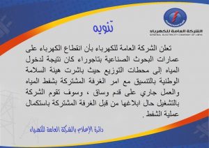 وأشارت الشركة إلى أنها ستقوم بتشغيل وإعادة الكهرباء للعمارات بعد أن يتم إبلاغها من قبل الغرفة المشتركة بإستكمال عملية الشفط المياه.