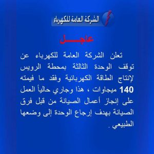 أعلنت الشركة العامة للكهرباء اليوم السبت عن توقف الوحدة الثالتة من محطة الرويس لانتاج الطاقة الكهربائية، وقد ذكرت الشركة أنها قد فقدت بهذا العطل ما قيمته 140 ميجاوات ، وأنها حاليا تعمل على إجراء أعمال الصيانة بأسرع وقت ممكن.