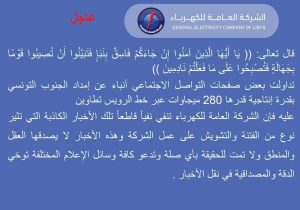 أكدت الشركة العامة للكهرباء عبر صفحتها على الفيس بوك أن ما تداولته اغلب صفحات التواصل الاجتماعي حول إمداد الجنوب التونسي بالكهرباء و بقدرة إنتاجية 280 ميجاوات عبر خط الرويس تطاوين هو خبر كاذب وشائعات لإثارة الفتنة والتشويش على عمل الشركة.