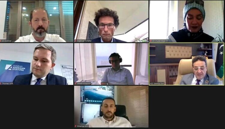 حيث تمت الندوة بحضور مدير برنامج الحوار السياسي الإقليمي لجنوب البحر الأبيض المتوسط (مؤسسة كونراد أديناور) “توماس فولك” ومدير مكتب الجزائر لمؤسسة كونراد أديناور “ماتياس شيفر” ومؤسسة منصة ازدهار للشركات العائلية – ليبيا “هدى المقيرحي “.