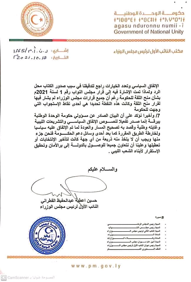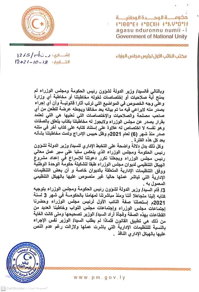 وأشارت الرسالة إلى أنه خلال الاجتماع الأول للمجلس الأعلى للإدارة المحلية المنعقد بمدينة طرابلس يوم الأربعاء الموافق 7 يوليو 2021 م وفي حضور النائب الثاني لرئيس مجلس الوزراء والسادة الوزراء والوكلاء بحكومة الوحدة الوطنية وعمداء البلديات وبعض المسئولين على المستوى الليبي الداخلي، وحضور مبعوث الأمين العام للأمم المتحدة إلى ليبيا على المستوى الدولي تم تقديمنا بصفة النائب الأول لرئيس مجلس الوزراء وهذا الاجتماع موثق إعلاميا فلماذا لم يثار الموضوع من قبل وزير الدولة لشؤون رئيس الحكومة ومجلس الوزراء في ذلك الوقت .