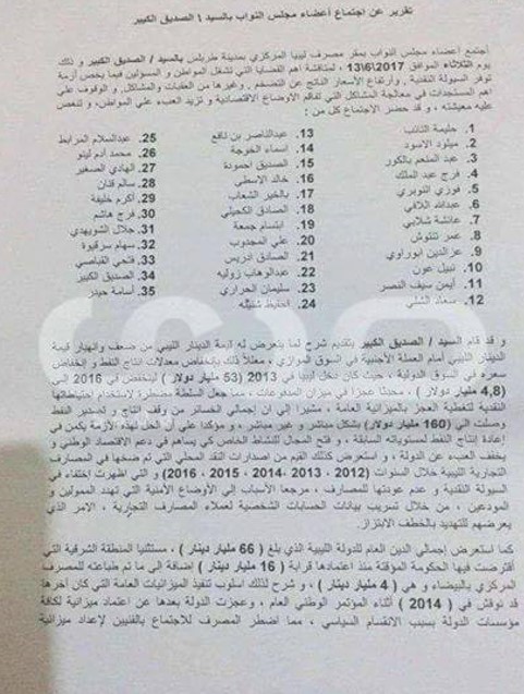 والجدير بالذكران المسودة بتاريخ 13/6/2017، في مقر مصرف ليبيا المركزي بطرابلس بحضور 34 عضو من البرلمان ، وذلك لمناقشة أهم القضايا التى تهم المواطن من إرتفاع الاسعار ونقص السيولة والأعباء التى تخص المواطن وملخص ماجاء فيها أن السيد / الصديق الكبير قد رد على العديد من التساؤلات التى وجهت إليه من السادة / أعضاء مجلس النواب.
