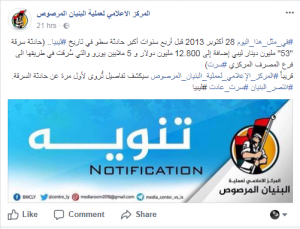 أعلن المركز الإعلامي لقوات عملية البنيان المرصوص الأحد، قرب كشف تفاصيل تروى لأول مرة عن أكبر حادثة سطو في تاريخ ليبيا، في إشارة إلى قضية سرقة ملايين الدينارات وهي في طريقها من مصرف ليبيا المركزي بطرابلس إلى فرع المصرف سرت