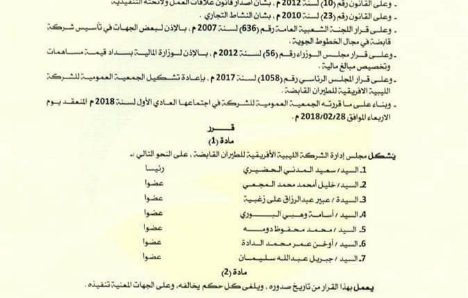 ويقضي هذا القرار بتشكيل مجلس إدارة للشركة الليبية الأفريقية للطيران برئاسة سعيد المدني الحضيري وبعضوية خليل العجمي وعبير زغيبة وأسامة اليوري بالإضافة إلى محمد دومة وأوخن الدادة و جبريل سليمان.