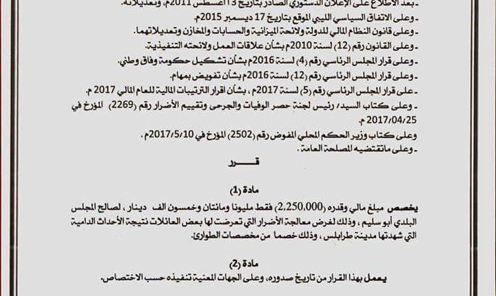 أعلن المجلس الرئاسي لحكومة الوفاق الوطني اليوم على صفحته على موقع التواصل الاجتماعي فيس بوك ، أنه قرر تخصيص مبلغ مالي لبدية أبو سليم  يقدر بحوالي مليونان و مئتان و خمسون ألف دينار ليبي ، و ذلك لغرض صيانة و معالجة الاضرار الناتجة عن التوتر الامني الذي عاشته المنطقة خلال الفترة السابقة .