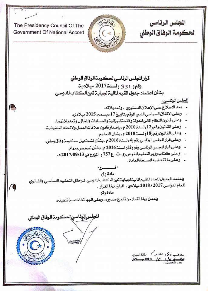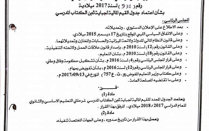أصدر المجلس الرئاسي لحكومة الوفاق الوطني الخميس ، القرار رقم  (931) لسنة 2017م بشأن جدول القيم المالية لجباية ثمن الكتاب المدرسي من مدارس التعليم الخاص لمرحلتي التعليم الأساسي والثانوي للعام الدراسي 2017/2018م .