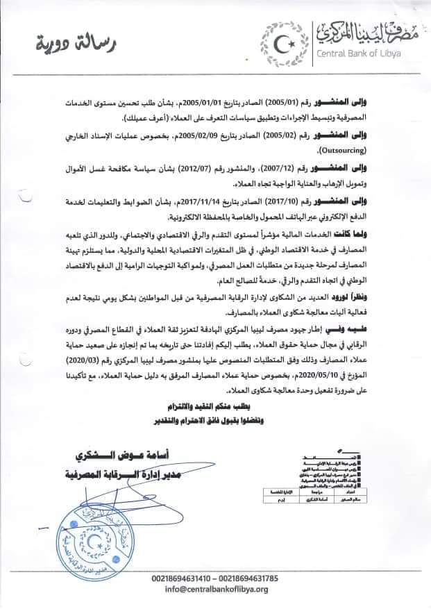 وجه مدير إدارة الرقابة المصرفية بمصرف ليبيا المركزي بنغازي “أسامة الشكري” رسالة إلى المدراء العامين بالمصارف ومدراء إدارات الفروع بالمنطقة الشرقية بشأن تفعيل وحدة معالجة شكاوى العملاء .