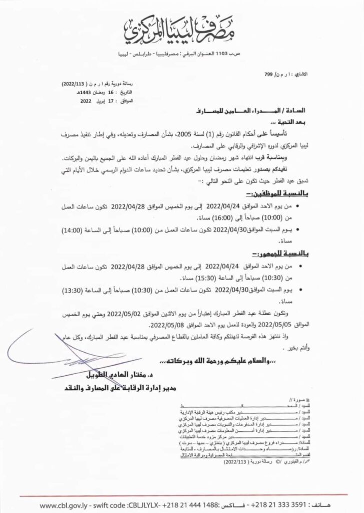 وجه مدير إدارة الرقابة المصرفية بمصرف ليبيا المركزي تعليمات لمدراء المصارف عن ساعات الدوام الرسمي قبل عيد الفطر.
