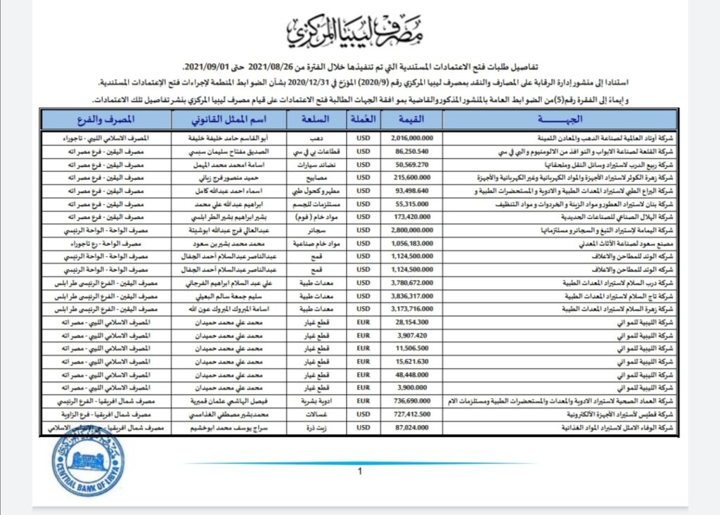 نشر مصرف ليبيا المركزي طرابلس تفاصيل طلبات فتح الاعتمادات المستندية التي تم تنفيذها خلال الفترة من 26/أغسطس /2021 حتى 01/سبتمبر/2021.