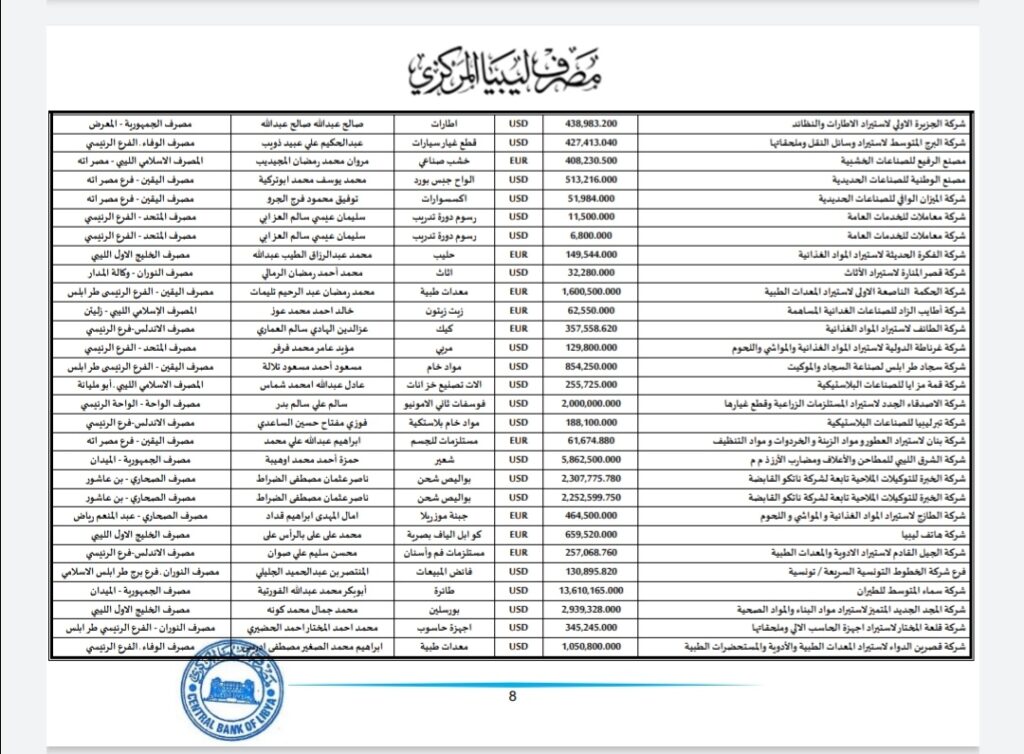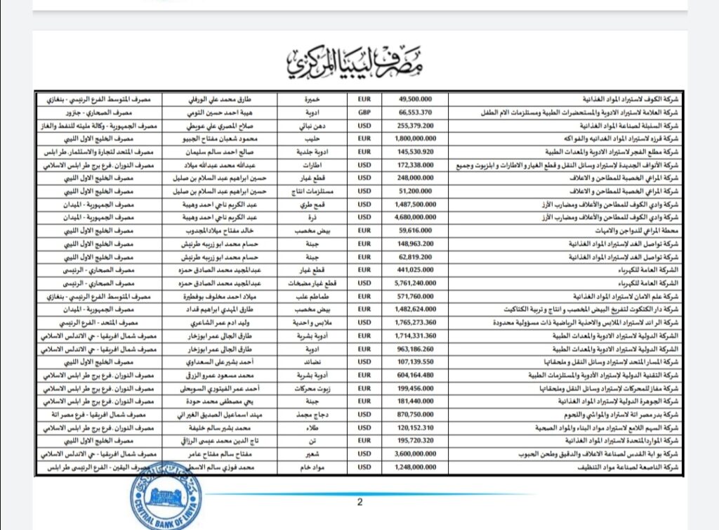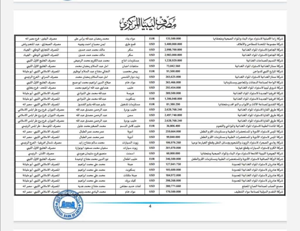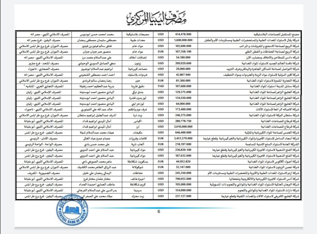 وذلك استناداً إلى منشور إدارة الرقابة على المصارف والنقد بمصرف ليبيا المركزي رقم (9/2020) المؤرّخ في 2020/12/31 بشأن الضوابط المنطمة لإجراءات فتح الإعتمادات المستندية وإيماءً إلى الفقرة رقم (5) من الضوابط العامة بالمنشور المذكور والقاضية بموافقة الجهات الطالبة فتح الاعتمادات على قيام مصرف ليبيا المركزي بنشر تفاصيل تلك الاعتمادات.