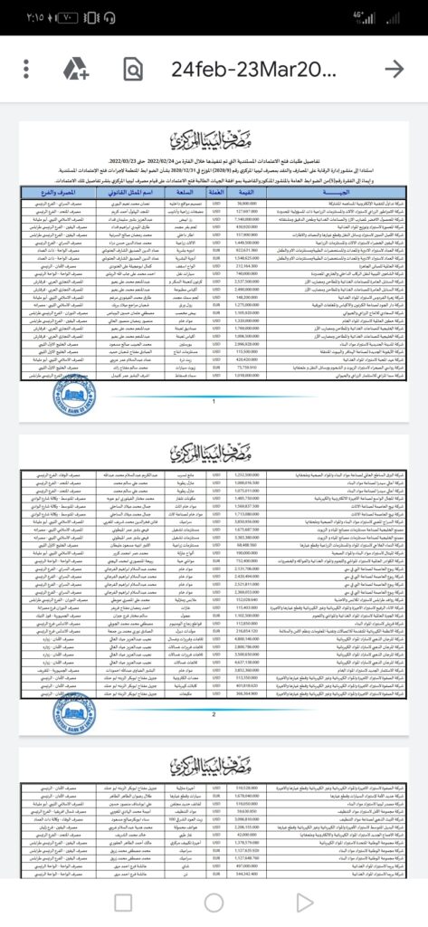نشر مصرف ليبيا المركزي تفاصيل طلبات فتح الاعتمادات المستندية التي تم تنفيذها خلال الفترة من 2022/02/24 حتى 2022/03/23.