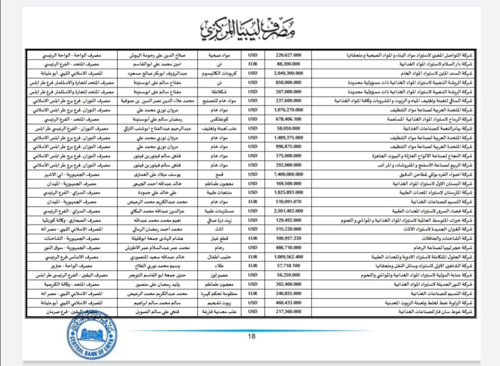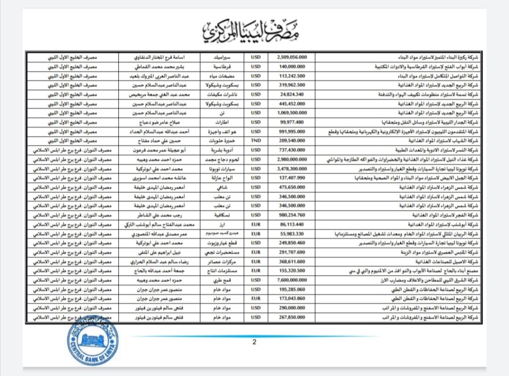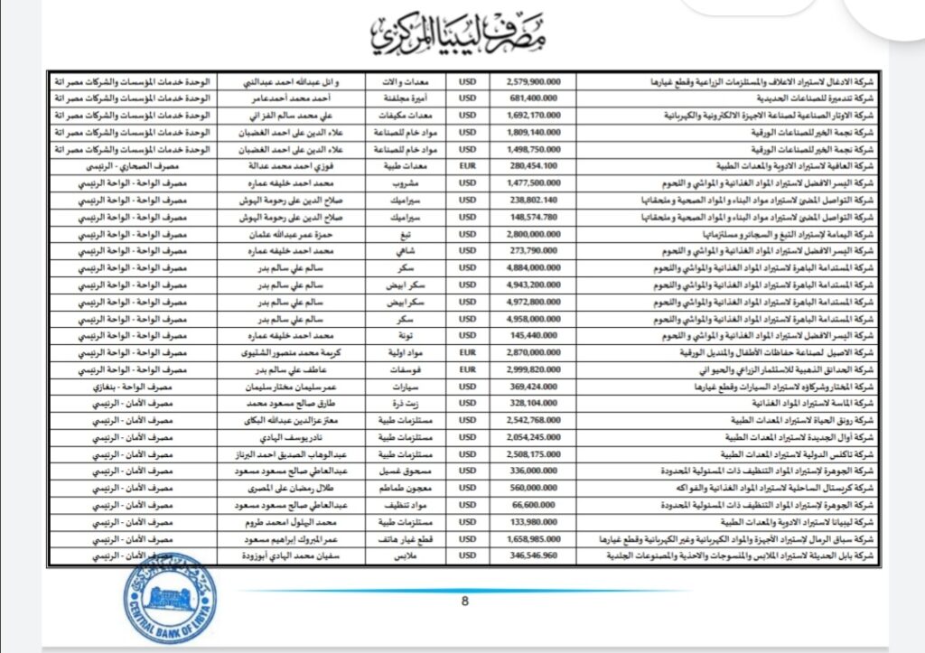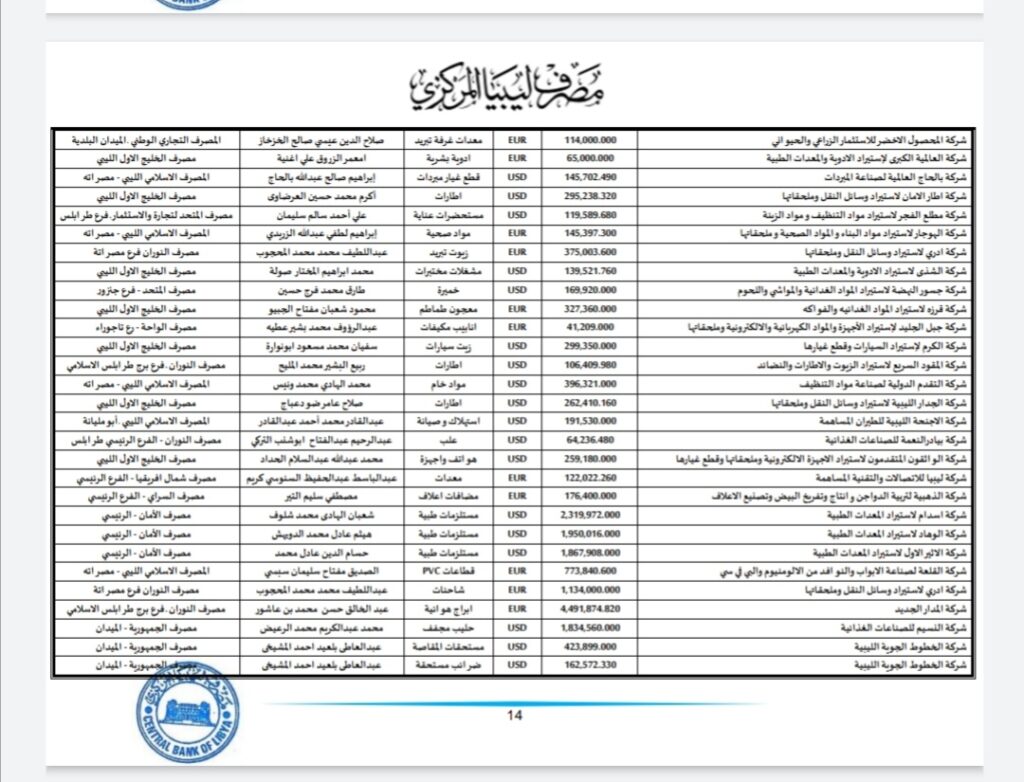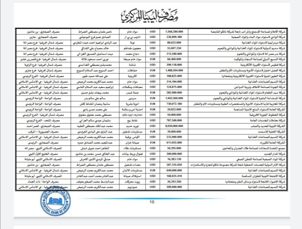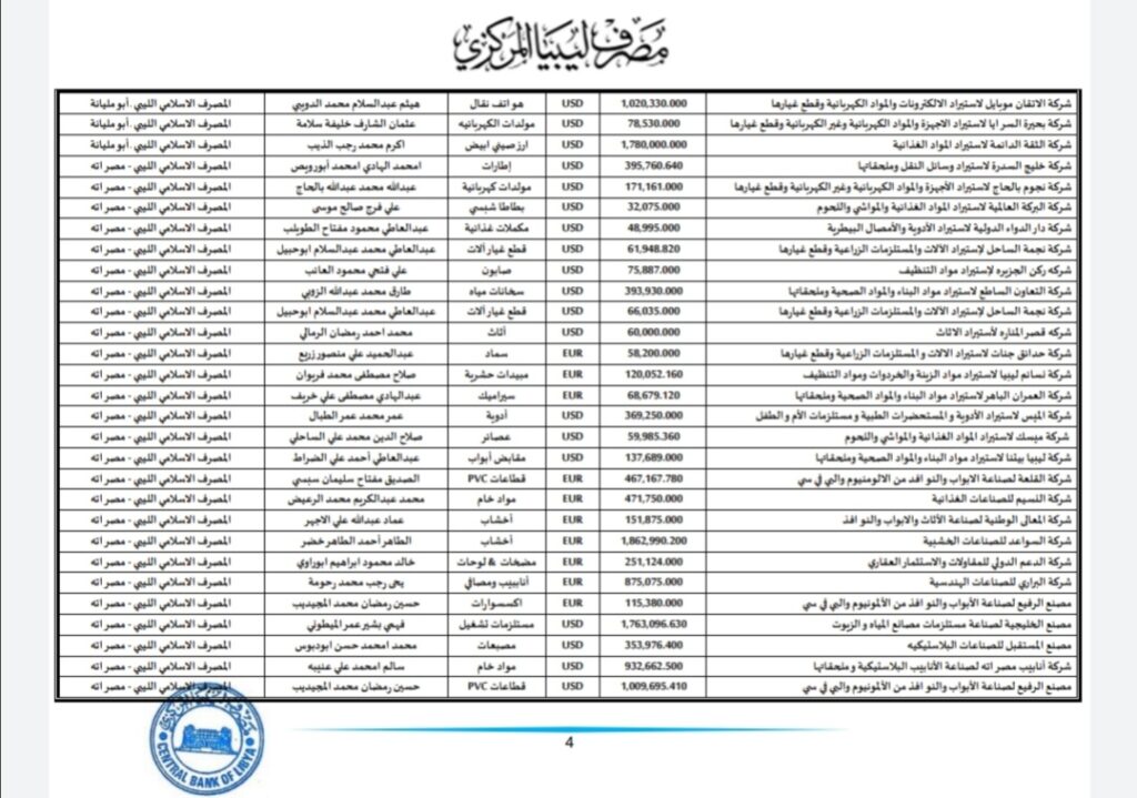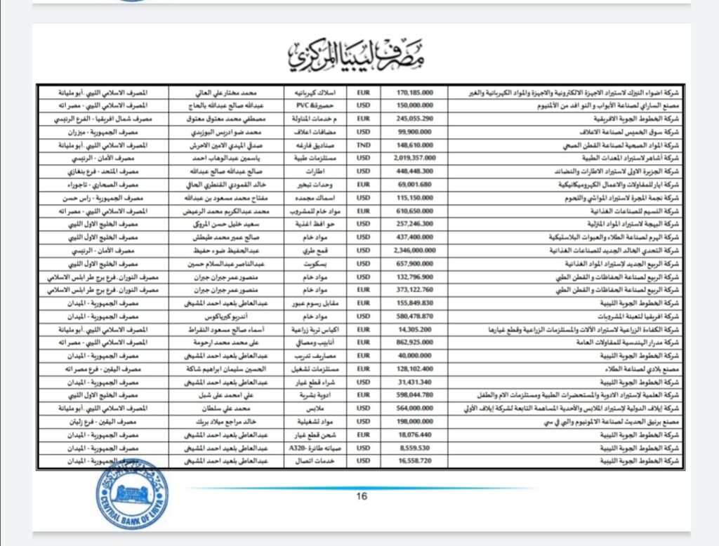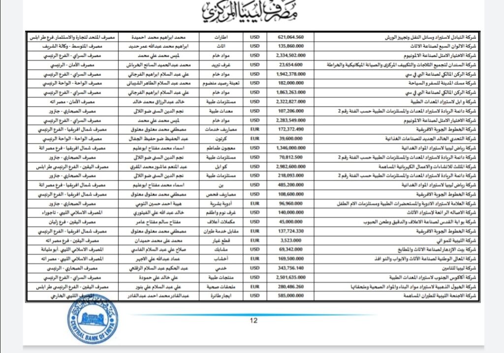 نشر مصرف ليبيا المركزي تفاصيل طلبات فتح الاعتمادات المستندية التي تم تنفيذها خلال الفترة من 2022/03/24 حتى 2022/04/06.