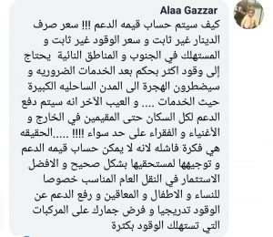 كما تسائل السيد علاء :كيف سيتم حساب قيمه الدعم ! سعر صرف الدينار غير ثابت و سعر الوقود غير ثابت و المستهلك في الجنوب و المناطق النائية  يحتاج إلى وقود اكثر بحكم بعد الخدمات الضروريه و سيضطرون الهجرة إلى المدن الساحليه الكبيرة حيث الخدمات، و العيب الآخر انه سيتم دفع الدعم لكل السكان حتى المقيمين في الخارج و الأغنياء و الفقراء على حد سواء !!!!