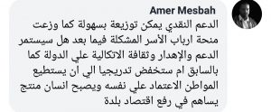 ومن جهته قال السيد أمير مصباح :الدعم النقدي يمكن توزيعه بسهولة كما وزعت منحة ارباب الأسر المشكلة فيما بعد، هل سيستمر الدعم والإهدار وثقافة الاتكالية علي الدولة كما بالسابق ام ستخفض تدريجياً إلى ان يستطيع المواطن الاعتماد علي نفسه ويصبح انسان منتج يساهم في رفع اقتصاد بلده.