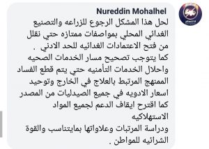 وقال أ. نور الدين :لحل هذا المشكل الرجوع للزراعه والتصنيع الغدائي المحلي بمواصفات ممتازه حتي نقلل  من فتح الاعتمادات الغدائيه للحد الادني  .