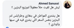 وعلق الإعلامي المختص بالشأن الاقتصادي “أحمد السنوسي”متسائلاً لماذا هل  وجدت حلاً معقولاً لتوزيع البنزين ؟ و هل يشتري المواطن في بنغازي وطرابلس لتر البنزين بنفس السعر الذي يشتري به في سبها واوباري ؟