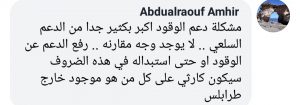 ومن جهته قال أ. عبد الرؤوف :مشكلة دعم الوقود أكبر بكثير جداً من الدعم السلعي و لا يوجد وجه مقارنه  فرفع الدعم عن الوقود او حتى استبداله في هذه الظروف سيكون كارثي على كل من هو موجود خارج طرابلس.