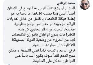 وعلق السيد محمد الرفادي قائلاً:السؤال لو وزع نقداً، أليس هذا توسع في الإنفاق أيضاً، أليس هذا يسبب تضخماً، ما نحتاجه هو إعادة هيكلة الإقتصاد بالكامل من خلال تعديلات للوائح موجودة أو حتى سن لوائح تنظيمية جديدة، البحث عن إطار يحتوي كل هذه الاقتراحات بدون الإخلال بالتوازن للاقتصاد، لابد من الخروج من وضعية الدولة المستهلكة الاتكالية على مواردها الناضبة و ترفع الدعم و تمنحه نقداً نفس الفلسفة و ممكن منح الدعم نقداً سوف يكون أشد بأساً على المواطن المتكل على الحكومة.