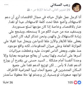 نشر الخبير الاقتصادي “رجب المسلاتي” بوست عبر صفحته الرسمية على الفيس بوك يتحدث فيه عن عمله طيلة السنوات السابقة في مجال الاقتصاد والاستهلاك.