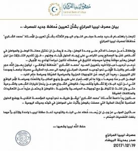عاجل : قال مصرف ليبيا المركزي البيضاء في بيان نشر على صفحته الرسمية أنه تابع تعيين ” محمد الشكري ” محافظا لمصرف ليبيا المركزي، وانه يرحب ترحيبا مباركا فيه بتعيين ” محمد الشكري ” كمحافظ توافقي