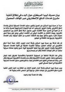 في بيان مصرف ليبيا المركزى يوم 28 مايو 2017 ، ﺣﻮﻝ ﺍﻟﺒﺪﺀ ﻓﻲ ﺇﻃﻼﻕ ﺗﻨﻔﻴﺬ ﻣﺸﺮﻭﻉ ﺧﺪﻣﺎﺕ ﺍﻟﺪﻓﻊ ﺍﻹﻟﻜﺘﺮﻭﻧﻲ ﻋﺒﺮ ﺍﻟﻬﺎﺗﻒ ﺍﻟﻤﺤﻤﻮﻝ والتي سبق ان كان هناك مثيل لها في مصرف التجارة والتنمية ، وجاء في البيان التالي :
