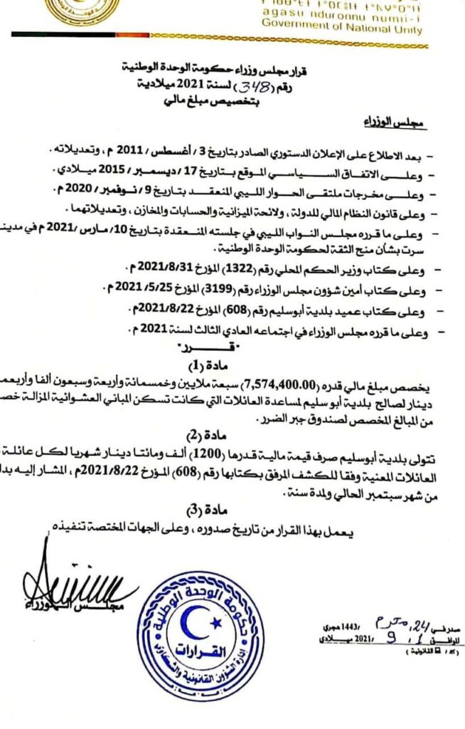 أصدر مجلس الوزراء بحكومة الوحدة الوطنية قراراً بتخصيص 7,574.400 مليون لصالح بلدية ابوسليم لمساعدة العائلات التي كانت تسكن المباني العشوائية المزالة خصم من المبالغ المخصصة لصندوق جبر الأضرار.